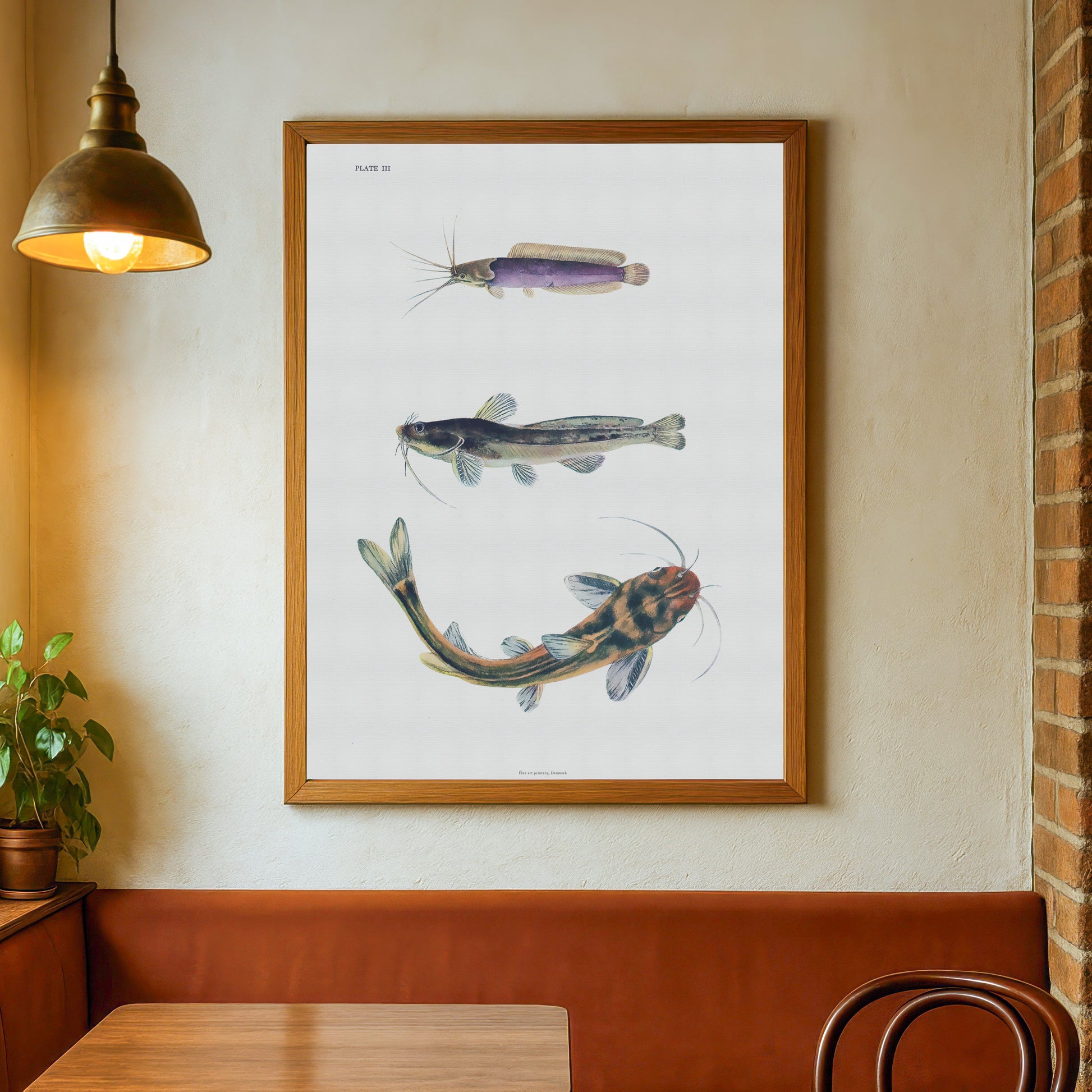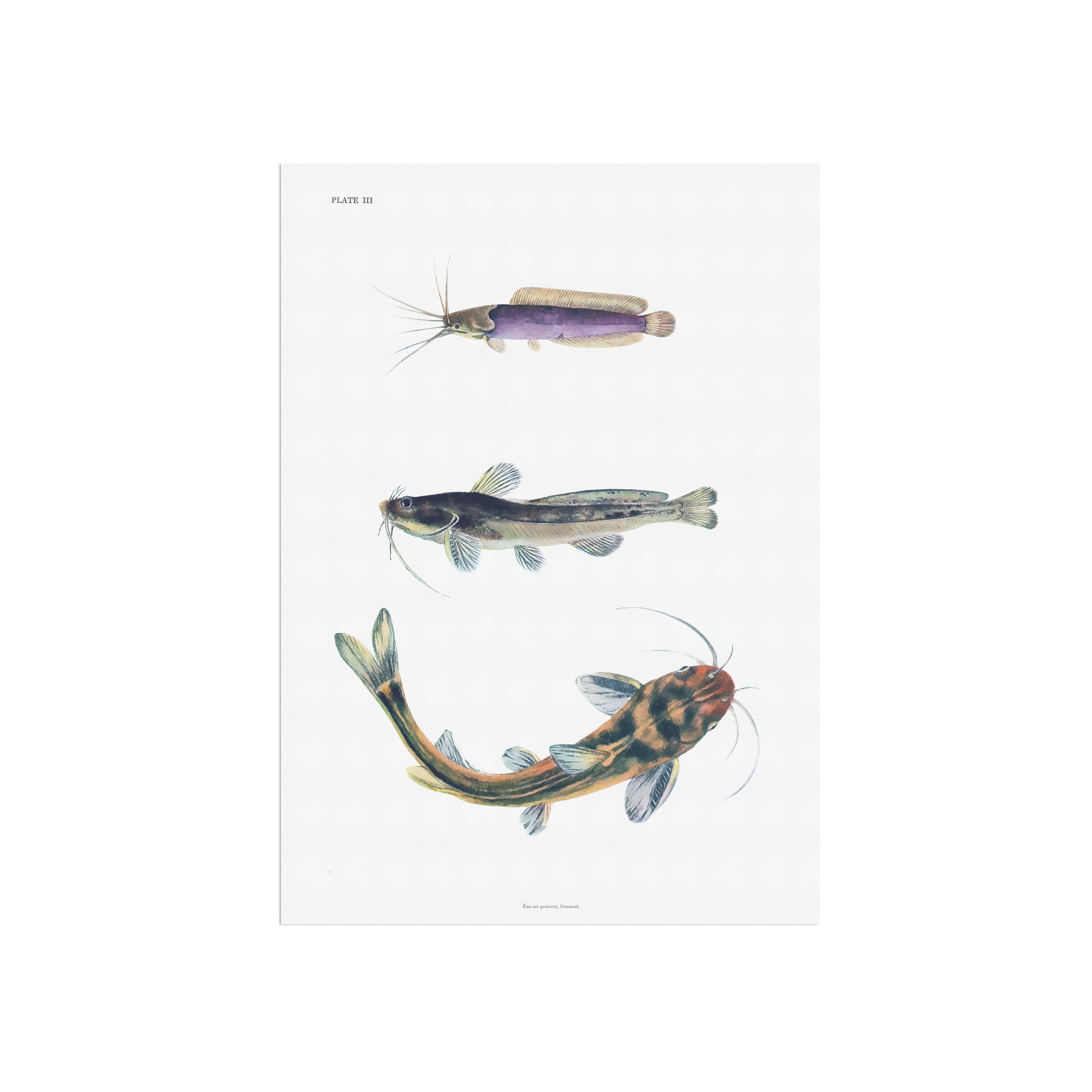 Adorn your walls with a truly unique piece of ichthyological history. This poster is a faithful reproduction of an illustration from the 1943 work, The Fresh-Water Fishes of China. It showcases the fascinating variety within the Catfish family, featuring three distinct species: