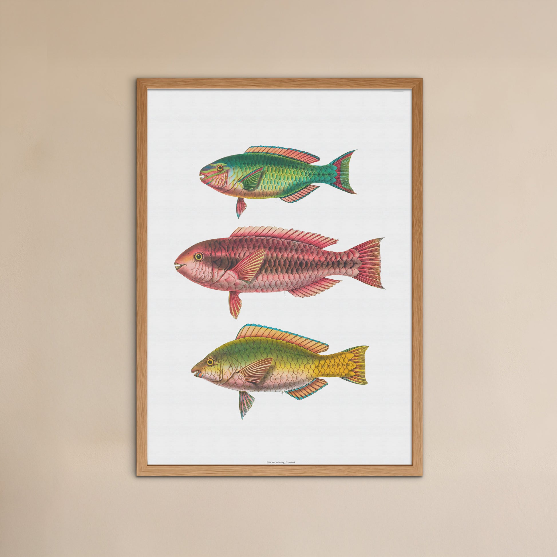 Immerse yourself in the stunning natural beauty of the 19th-century underwater world with this captivating vintage tropical fish poster. This exquisite art print showcases three beautifully detailed Parrotfish, derived from the prestigious 1862 Atlas ichthyologique des Indes orientales (Ichthyological Atlas of the East Indies).